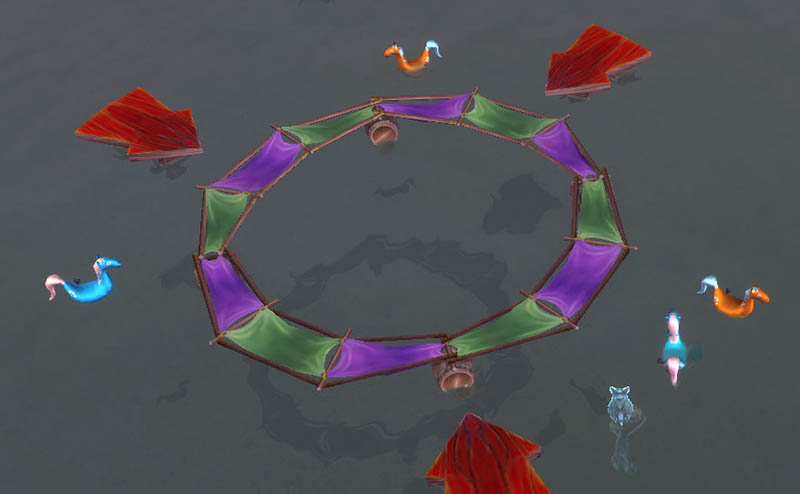 Just offshore is the game’s target, which you must dispel your Wings to land on – awards 1 point for landing within the area, 3 points for within the ring itself, and 5 points (plus the Blastenheimer Bullseye 10pt achievement) for the exact center of the ring. Any combination of landings which accumulate five (or more) points will win a Darkmoon Game Prize.
