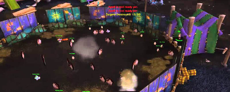 Just past the Carousel, troll barker Rinling runs a shooting gallery. Pay him a Token to grab an Ultrasafe Target Blunderbuss and press 1 to blast away for sixty seconds at whichever target is activated by the ghostly green icon. Awards 1 point for hitting the right target, with 1 additional bonus point (plus the Quick Shot! 10pt achievement) for doing it within half a second of the icon lighting up the target – scoring 25 points wins a Darkmoon Game Prize.