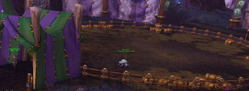 It’s a long and winding path from the entry portal down to the Darkmoon Faire proper, but never fear! Dusty Brandom stands at the ready with a stable of tallstriders to lend out to visitors – particularly handy for characters too low-level (or too poor) to have mounts of their own. If this is your character’s first time visiting Darkmoon Aisle, they’ll receive the Come One, Come All! (10pt) achievement just for making it this far.
