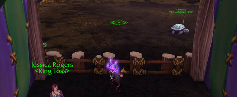 The last game on the midway is Turtle Tossing, where Jessica Rogers plies you to try tossing rings at a surprisingly agile turtle. One Token gets you ten rings to toss, though you only need to land three to win a Darkmoon Faire Prize. If you can land all ten rings in a single game, you’ll earn the Triumphant Turtle Tossing (10pt) achievement along with a Sonic-inspired Darkmoon Ring Flinger toy.