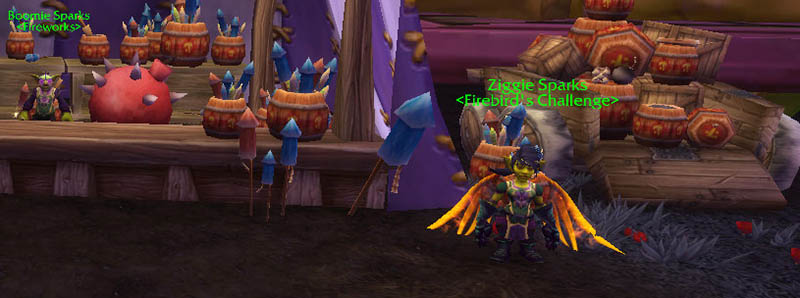 Joining her pyrotechnic brother Boomie at the Darkmoon Faire, goblin engineer Ziggie Sparks challenges passerbys to try out her Blazing Wings. Playing along will launch you into the sky, where you can loop and soar to your heart’s content… at least as long as the wings last. They’ll expire within ten seconds (after which you’ll float safely to the ground – great for the Going Down? 10pt achievement) unless you recharge them by flying through one of the many flaming hoops scattered across Darkmoon Isle.