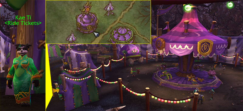 Of perhaps greatest benefit is the Darkmoon Carousel. Darkmoon Ride Tickets are sold in booklets of five by Kae Ti, who stands at the entrance to the ride. The Tickets inside are not BoP, so you can save a bit of coin by using a lower-level alt to buy the Tickets to send to a higher-level one. While there are several rideable figures, one merely needs to stand upon the ride’s platform to receive the WHEE! buff – increases five minutes per tick to a maximum of one hour – which increases all experience and reputation gains by 10%.