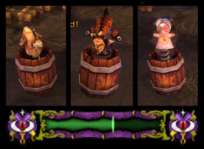 The first game along the Midway is Whack-a-Gnoll, overseen by a mallet-wielding orc named Mola. Once the game begins, you’ll have sixty seconds to scurry about the game area, pressing 1 to swing your mallet and whack whatever is popping out of the barrel directly in front of you. The three kinds of targets include: